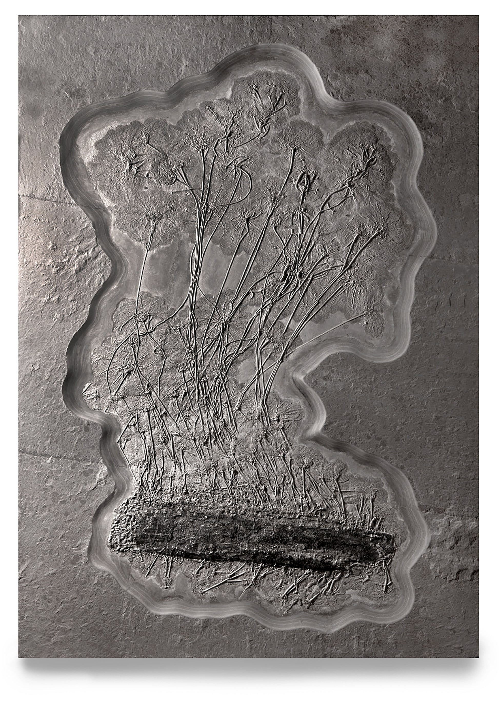 - Beschreibung: Eine außergewöhnlich große Kolonie der Seelilie Seirocrinus subangularis, die an fossilem Treibholz befestigt ist. Mit einer Fossillänge von beeindruckenden 340 cm und über 100 erhaltenen Kronen repräsentiert dieses Exemplar einen der beeindruckendsten Funde seiner Art. Die Kombination aus außergewöhnlicher Größe (H 345 cm, B 242 cm, T 13 cm), exzellenter Präparation und ästhetischer Qualität macht dieses Fossil zu einem weltweit einzigartigen Schaustück.