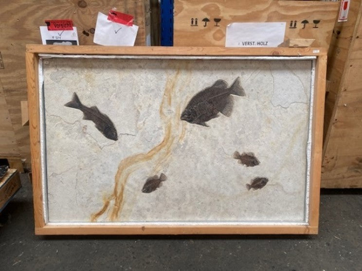 Diese wunderbare Präsentation von Süßwasserfischen aus dem prähistorischen System dreier Seen, das als Green River Formation bekannt ist, zeichnet sich durch eine hervorragende Erhaltung bis ins kleinste Detail aus. Die attraktive goldfarbene Kalksteinmatrix stammt aus dem F-2-Horizont dieser berühmten geologischen Formation.