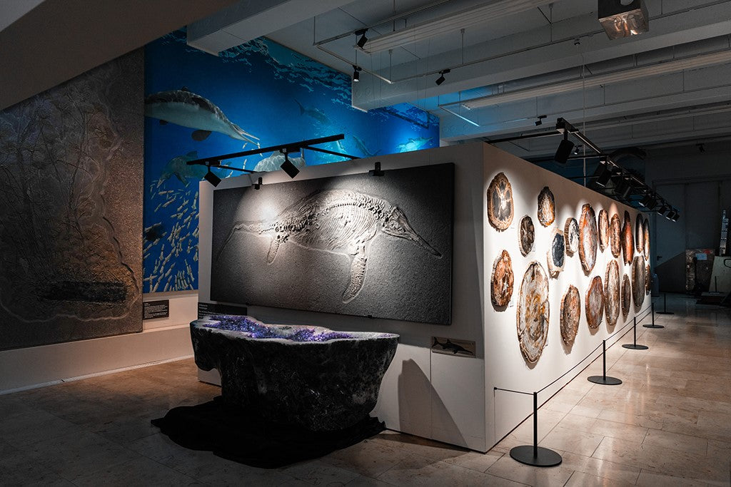 - Beschreibung: Dieses außergewöhnliche Exemplar eines 180 Millionen Jahre alten Ichthyosauriers stammt aus den berühmten Lias Epsilon-Schichten des Urweltsteinbruchs in Holzmaden, Deutschland. Das Fossil ist bemerkenswert gut erhalten und wurde mit außergewöhnlicher Präzision präpariert, sodass es nahezu vollständig rekonzipiert wurde. Besonders hervorzuheben ist, dass der Kopf dieses Ichthyosauriers von einem anderen, aber ebenfalls hervorragend erhaltenen Exemplar stammt, was durch die hervorragende Präparation nahtlos in die Gesamtstruktur integriert wurde. Die Kopfposition und das vordere Flossenpaddel wurden präzise ausgerichtet, wodurch das Fossil in seiner ursprünglichen Form und Anatomie erlebbar wird. Die gut erhaltenen Zähne und die sichtbaren Mageninhalte, die unter den Rippen erhalten sind, bieten wertvolle Einblicke in die Lebensweise und Ernährung dieses Meeresreptils.